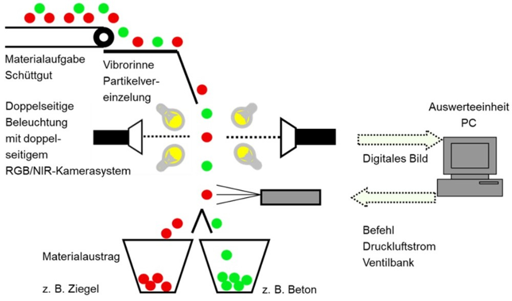 Mineralische Bauabfälle liegen häufig als Gemisch verschiedener Materialien vor. Um daraus hochwertige Sekundärrohstoffe zu gewinnen, müssen sie einen aktiven, in der Regel mehrstufigen Aufbereitungsprozess durchlaufen. Dabei hängt die Qualität der erzeugten Recycling-Baustoffe von den jeweiligen Ausgangsmaterialien sowie der eingesetzten Aufbereitungstechnologie ab. Zu den Grundoperationen der Bauabfall-Aufbereitung zählen das Zerkleinern, das Klassieren sowie das anschließende Sortieren. Dafür bedarf es innovativer Lösungen: In der Regel sind traditionelle Sortiertechniken darauf ausgerichtet, Metalle und Leichtstoffe aus den Baureststoffen zu entfernen. Doch für bestimmte Anwendungen ist auch die Trennung unterschiedlicher mineralischer Bestandteile erforderlich. Hierzu wurden im Rahmen von Forschungsvorhaben vor allem Baustoffgemische mit einem sensorgestützten Freifallsortierverfahren voneinander separiert. Dies erfolgte in der Aufbereitungsstrecke im Recyclingtechnikum des Institutes für Angewandte Bauforschung (IAB, Weimar). Hierbei wurden die Materialien zu Beginn in ihre Partikel zersetzt und anschließend auf einem Fallweg sortiert. Dieses Verfahren kam bei den Versuchen von KLB ebenfalls zum Einsatz, um seine technische Eignung zu testen.