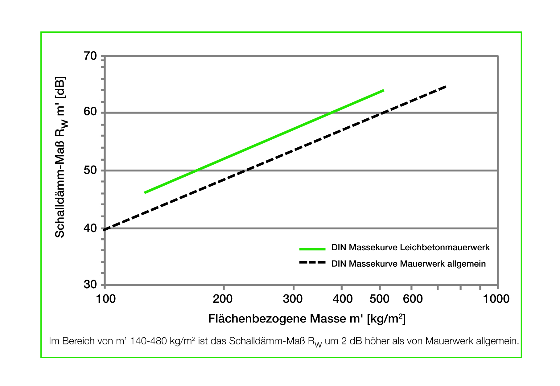 Masse und Biegesteifigkeit haben entscheidenden Einfluss auf die Schalldämm-Eigenschaften einer einschaligen Wandkonstruktion. Aufgrund seiner porigen Struktur und der verwendeten Zuschläge hebt sich Leichtbeton hierbei positiv von anderen massiven Mauerwerksteinen ab: Die in der jetzt gültigen DIN 4109 festgelegten Massekurven sehen in Abhängigkeit von der flächenbezogenen Masse m‘ einen Bonus von zwei Dezibel für das bewertete Schalldämm-Maß Rw von Leichtbeton-Mauerwerk vor. Im Klartext heißt das, dass massive Leichtbeton-Trennwände in einem Gebäude rechnerisch immer zwei Dezibel mehr Schall absorbieren, als vergleichbare Wandaufbauten mit gleicher Masse. Leichtbetonsteine verbinden auf diese Weise einen hohen Schallschutz mit einer hervorragenden Wärmedämmung. Eine besondere Situation ergibt sich in Hinblick auf die geänderte DIN 4109 jedoch bei dämmstoffgefüllten Mauersteinen mit Rohdichteklasse unter 0,8 kg/dm³ und Wanddicke über 24 Zentimetern: Für die große Bandbreite der hochleistungsfähigen Außenwand-Mauersteine aus Leichtbeton kann nach der neuen DIN 4109 bisher kein Schallschutz-Nachweis für alle baupraktischen Situationen geführt werden. Die Norm sieht für diese Fälle explizit ergänzende bauaufsichtliche Zulassungen vor, die die besonderen bauakustischen Eigenschaften erfassen.