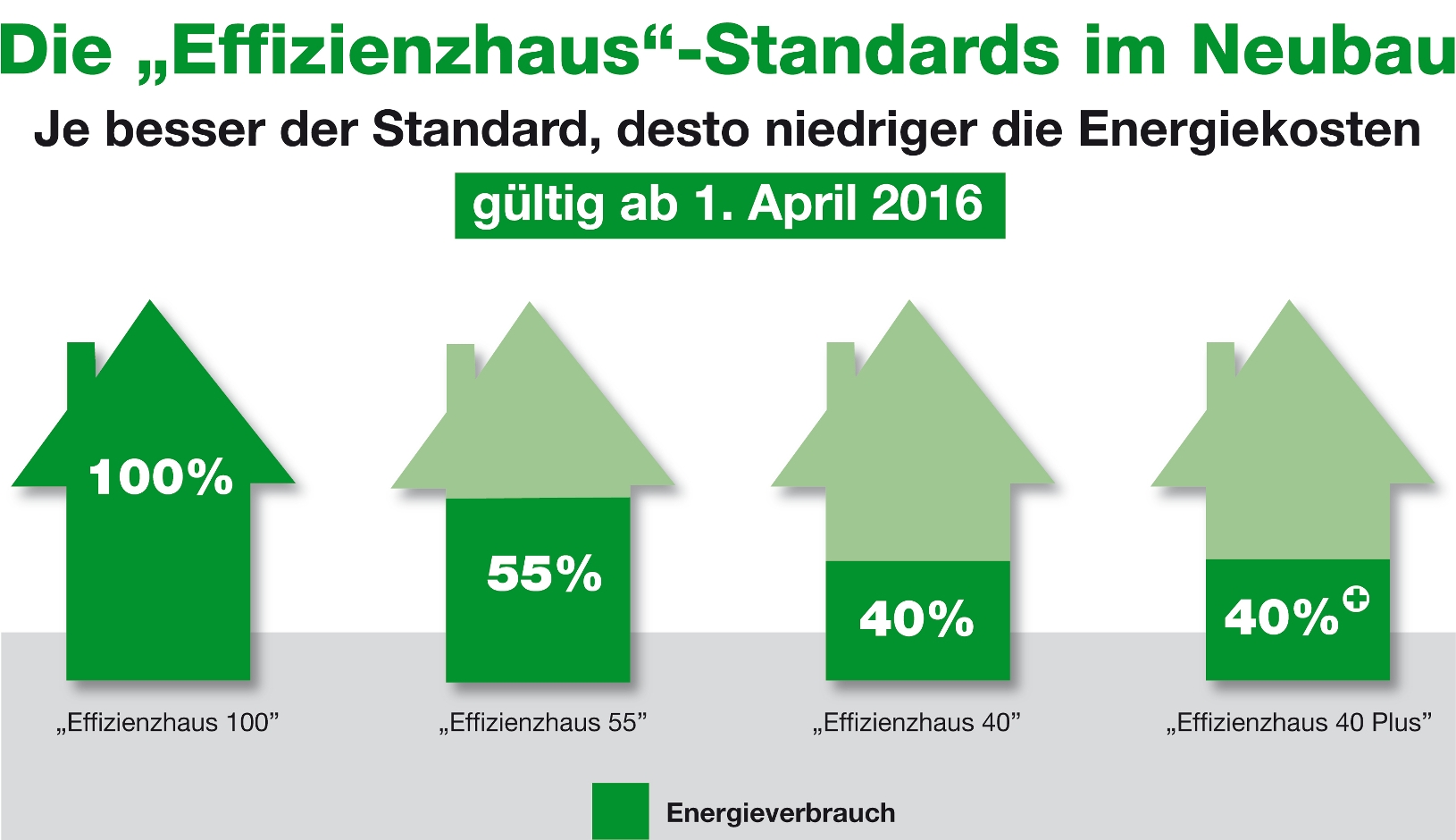 Energiekosten einsparen, Immobilienwert steigern, Wohnkomfort erhöhen: Hohe energetische Standards rücken mit den Neuerungen der Energieeinsparverordnung (EnEV 2014/16) ab dem 1. April 2016 weiter in den Fokus. Unter anderem müssen Neubauten ihren Primärenergiebedarf nochmals um 25 Prozent verringern. Vor diesem Hintergrund ändert sich auch die KfW-Förderung: Das aktuelle KfW-Effizienzhaus 70 wird damit quasi Mindeststandard und läuft folglich als Fördermaßnahme aus. Das KfW-Effizienzhaus 55 sowie das KfW-Effizienzhaus 40 bleiben bestehen. Ausdruck der Verschärfung ist besonders das neue „KfW-Effizienzhaus 40 Plus“, das ab April 2016 das höchste energetische Einsparniveau definiert. Gleichzeitig steigen die Förderbeträge, um einen zusätzlichen Anreiz für hohe energetische Ausführungen zu schaffen.