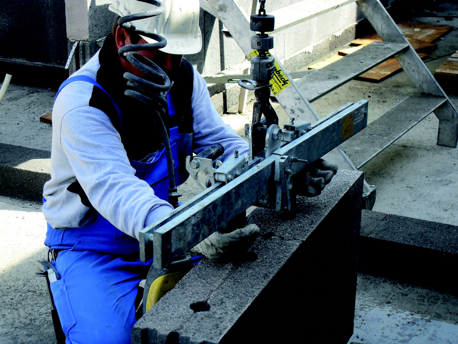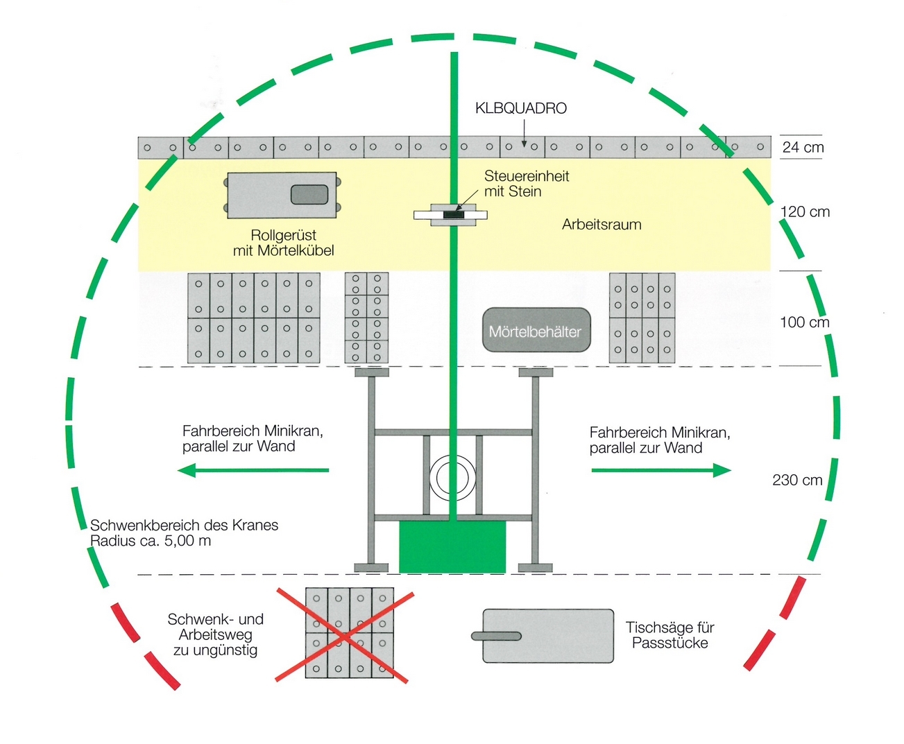 Produktives Arbeiten beginnt mit der Einrichtung der Baustelle. Durch die Lagerung von Leichtbeton-Elementen und Mörtel im Arbeitsbereich des Versetzgerätes, lassen sich Arbeitswege verkürzen und -abläufe beschleunigen. Die Stirnflächen der Planelemente verfügen über eine Flachverzahnung, die sich positiv auf die Anschlussgewerke im Bereich von Fenstern, Türen und Laibungen auswirkt. Mit Hilfe der Versetzzange können Blöcke und Blockabschnitte schnell, leicht und wirtschaftlich versetzt oder umgestellt werden. Bereits vier KLBQUADRO-Leichtbeton-Planelemente (Zulassung Z-7.1-852) ergeben einen Quadratmeter Außenwand. Die Rationalisierung zahlt sich aus: Arbeitszeitrichtwerte von 0,38 Stunden für volles Mauerwerk sowie 0,42 Stunden pro Quadratmeter für gegliedertes Mauerwerk ermöglichen den zügigen Bau von LeichtbetonWänden mit einer Wanddicke von 11,5 bis 24 Zentimetern.