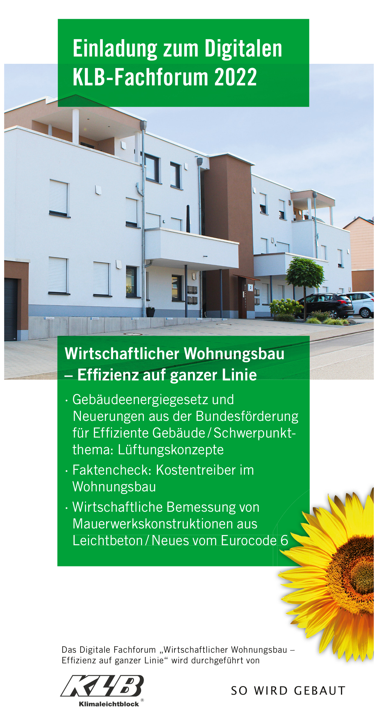 Anerkannte und sichere Fortbildung: Aufgrund des aktuellen Pandemiegeschehens findet das renommierte KLB-Fachforum auch 2022 wieder als Web-Seminar statt. Unter dem Motto „Wirtschaftlicher Wohnungsbau – Effizienz auf ganzer Linie“ erläutern namhafte Experten am 22. Februar sowie 10. März, wie Bauwerkskosten, gesetzliche Auflagen und energetische Ziele effektiv in der Balance zu halten sind. Dabei zieht Dipl.-Ing. Stefan Horschler (Hannover) unter anderem Zwischenbilanz zum Gebäudeenergiegesetz (GEG) und zeigt praxisnahe Lösungen auf, die den jüngsten Klimazielen entsprechen. Im Anschluss erläutert Dipl.-Ing. Dietmar Walberg (Kiel), welche Maßnahmen am Wohnungsbau unnötig kostenintensiv sind und vermieden werden können. Zu guter Letzt beschäftigt sich Univ.-Prof. Dr.-Ing. Carl-Alexander Graubner (München) mit den Eurocode 6-Auflagen und klärt, wie sich die Bemessung von Leichtbeton-Mauerwerk wirtschaftlich und unkompliziert durchführen lässt. Für die Teilnahme am anerkannten KLB-Fachforum erhalten Planer Fortbildungspunkte der zuständigen Architekten- und Ingenieurkammern. Eine kostenpflichtige Anmeldung (35 Euro) ist noch bis 15. Februar unter www.klb.de (Rubrik: KLB-Fachforum) möglich – oder per E-Mail (info@fachtagung-bau.de) sowie Fax (0214-2069150).