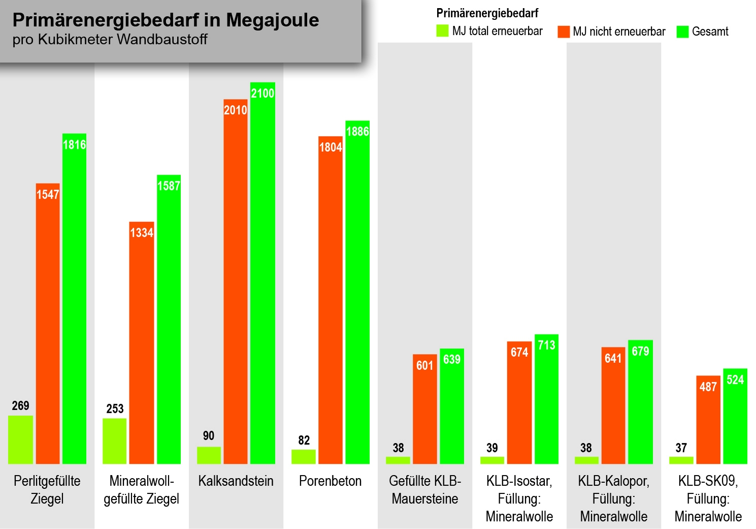 Im direkten Vergleich der betrachteten Parameter zu anderen Mauersteinen zeigen sich signifikante Unterschiede (vgl. Diagramm 1). Die deklarierte Bezugseinheit bezieht sich auf die Herstellung von einem Kubikmeter Mauerstein. So beläuft sich der Gesamt-Primärenergiebedarf gefüllter Leichtbeton-Mauersteine des rheinland-pfälzischen Baustoffherstellers KLB-Klimaleichtblock auf im Mittel 639 Megajoule pro Kubikmeter Mauerstein. Davon stammen 38 Megajoule aus regenerativen Energieträgern. In einer Gegenüberstellung des Primärenergiebedarfs mit anderen massiven Wandbaustoffen werden die Unterschiede besonders deutlich. So benötigen gefüllte Leichtbeton-Mauersteine im Vergleich zu perlitgefüllten Mauerziegeln nur rund 35 Prozent des Energieaufwandes. Der gefüllte Mauerstein „KLB-SK09“ beispielsweise weist besonders herausragende Werte auf. Sein Gesamt-Primärenergiebedarf liegt bei nur 524 Megajoule pro Kubikmeter Mauerstein.