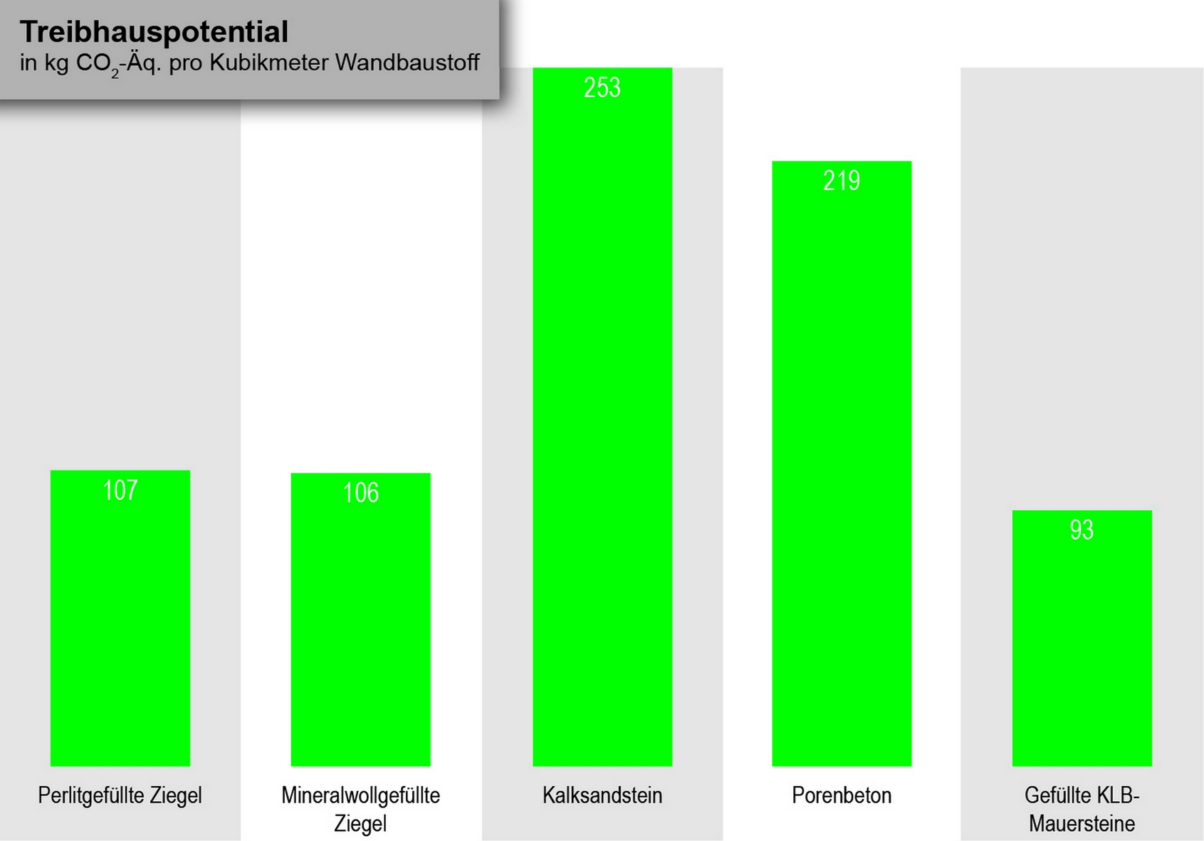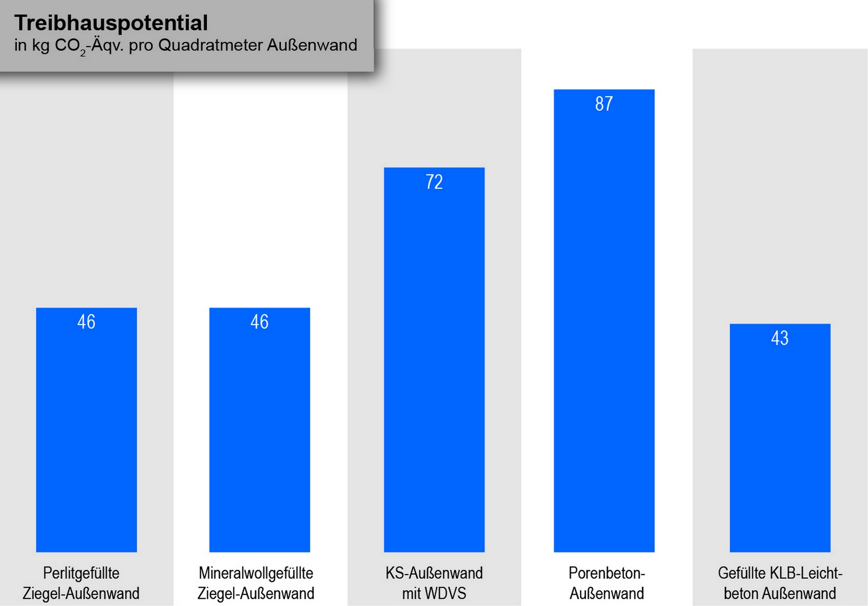 Bei einer Betrachtung unterschiedlicher Wandkonstruktionen mit funktionalen Äquivalenten (Wandstärke und Wärmeschutz) zeigen sich noch deutlichere Abweichungen der einzelnen Baustoffe bei den hier betrachteten Öko-Kennzahlen. Im vorliegenden Fall wurden vier baupraktisch übliche Wände mit unterschiedlichen Baustoffen „erstellt“ und ein Wärmedämmwert der Außenwand (U-Wert) von 0,23 W/m2K zu Grunde gelegt. Es erfolgt ein Vergleich der Wandkonstruktionen aus Kalksandstein nebst Wärmedämm-Verbundsystem, perlitgefüllten und mineralwollgefüllten Mauerziegeln, Porenbeton sowie gefüllten Leichtbeton-Mauersteinen. Der Mauerwerksaufbau mit Porenbeton und gefüllten Mauersteinen besteht aus Innenputz, dem Mauerstein sowie dem Außenputz. Die Kalksandstein-Außenwand wurde zusätzlich mit einem Wärmedämm-Verbundsystem ausgestattet, um die notwendige Wärmedämmung zu erreichen.