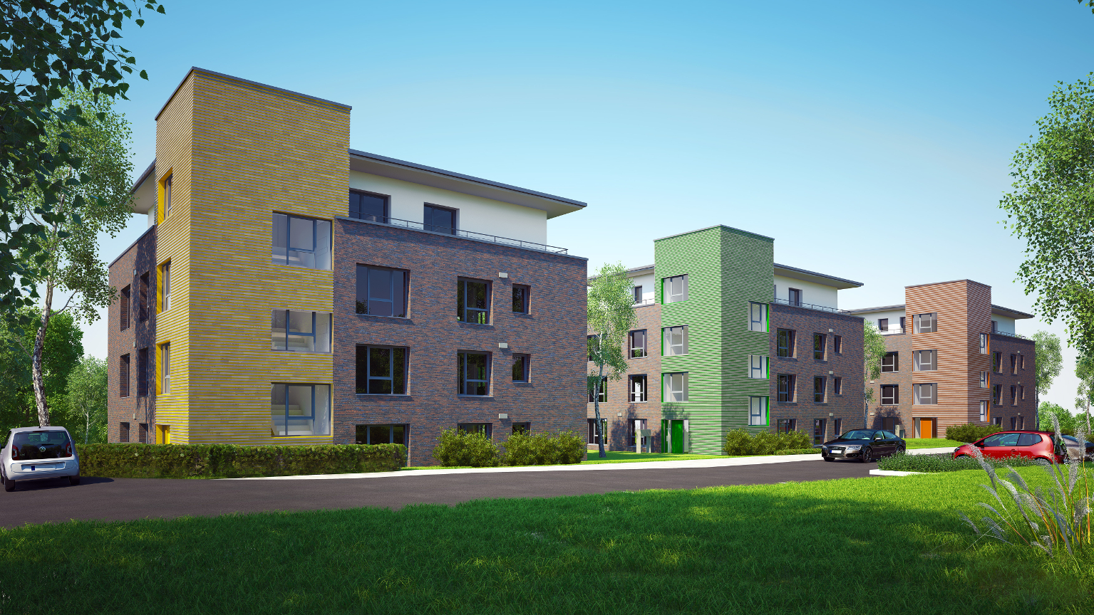 Der Entwurf der Reppco-Geschäftsführerin Dipl.-Ing. Christiane Behrens sah für den gewonnenen Investor, die WohnBau eG Goch, drei vierstöckige Mehrfamilienhäuser mit jeweils 10 Wohneinheiten über einer gemeinschaftlichen Tiefgarage vor. Die Gebäude erhielten durch ein kleinformatiges Verblendmauerwerk eine reizvolle Fassaden-Optik. Der dabei farblich besonders hervorgehobene Treppenhaus- und Aufzug-Bereich trägt zudem zu einem aufgelockerten Erscheinungsbild der ansonsten kompakten Baukörper bei.
