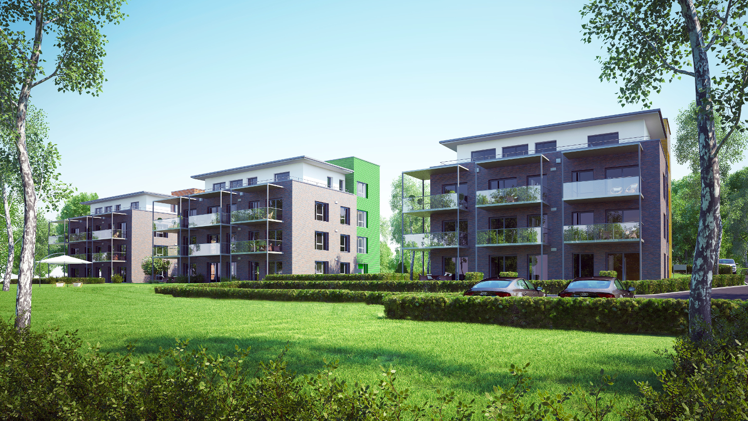 Variable Grundrisse und Wohnungsgrößen von 50 bis 120 Quadratmetern stellten schon frühzeitig eine breite Nachfrage für die Mietwohnungen sicher. Im obersten Geschoss aller drei Häuser finden sich luxuriöse Penthouse-Wohnungen mit großflächiger Dachterrasse. Neben einer hochwertigen Ausstattung wurden alle Wohnungen barrierefrei gestaltet.