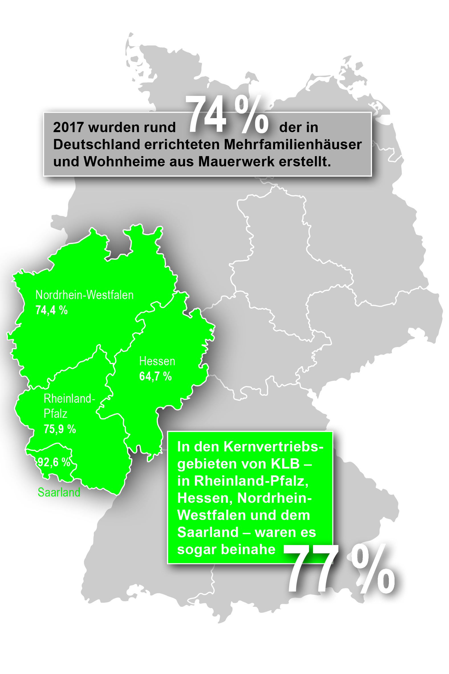 Rheinland-Pfalz, Saarland, Hessen und Nordrhein-Westfalen – das sind die Kerngebiete für den Handel mit KLB-Leichtbetonmauerwerk aus dem Neuwieder Becken. Wie bundesweit ist auch in diesen Gebieten Mauerwerk nach wie vor der beliebteste Baustoff bei der Errichtung von Wohnbauten. So betrug der Anteil von Mauerwerk am Bau von Mehrfamilienhäusern 2017 deutschlandweit rund 74 Prozent. In den KLB-Kerngebieten waren es sogar fast 77 Prozent.