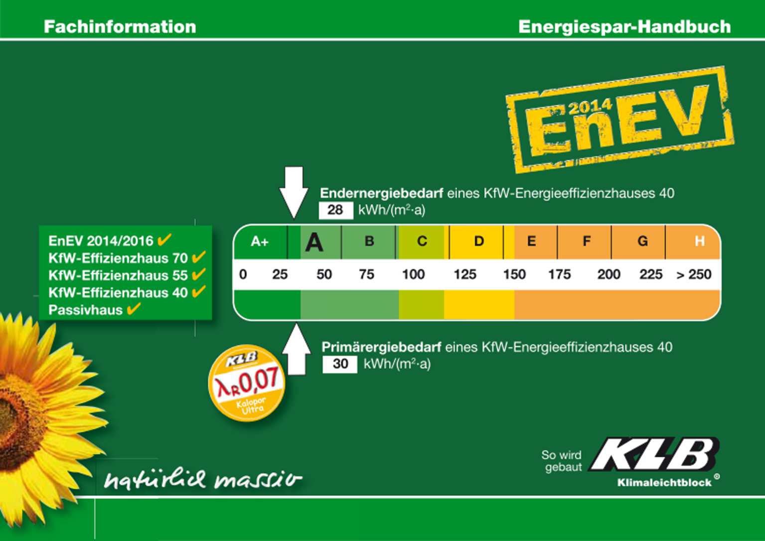 Energie sparen leicht gemacht: Das aktualisierte „Energiespar-Handbuch“ von KLB informiert Planer und Bauunternehmer verständlich über die wichtigsten Neuerungen der Energieeinsparverordnung (EnEV) 2014/2016. Die übersichtliche Zuordnung der einzelnen KLB-Wandsysteme zum jeweiligen Energiesparstandard ermöglicht zudem eine schnelle Auswahl des passenden Leichtbetonsteins. Dabei deckt die Broschüre das ganze Spektrum ab – vom Standardhaus nach EnEV bis zum KfW-Passiv- und Plusenergiehaus. „Mit den verschiedenen KLB-Funktionswänden können wir flexibel auf jede bauliche Anforderung reagieren“, betont KLB-Geschäftsführer Andreas Krechting. „Ob zweischalig mit Kerndämmung, monolithisch oder einschalig mit Wärmedämmverbundsystem – unser Handbuch zeigt verschiedene Möglichkeiten auf, wie Bauexperten die gewünschten Energiesparziele erreichen können."