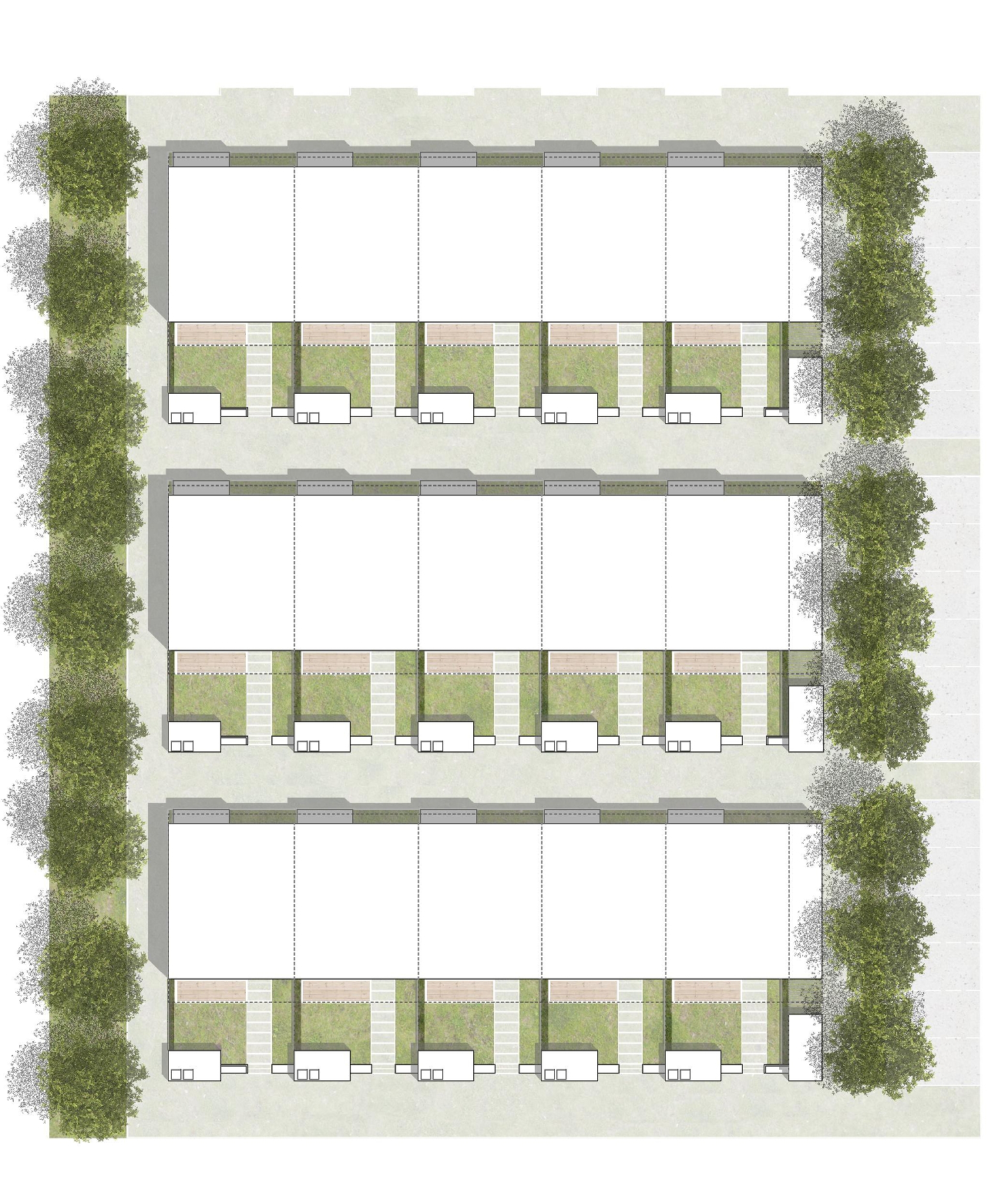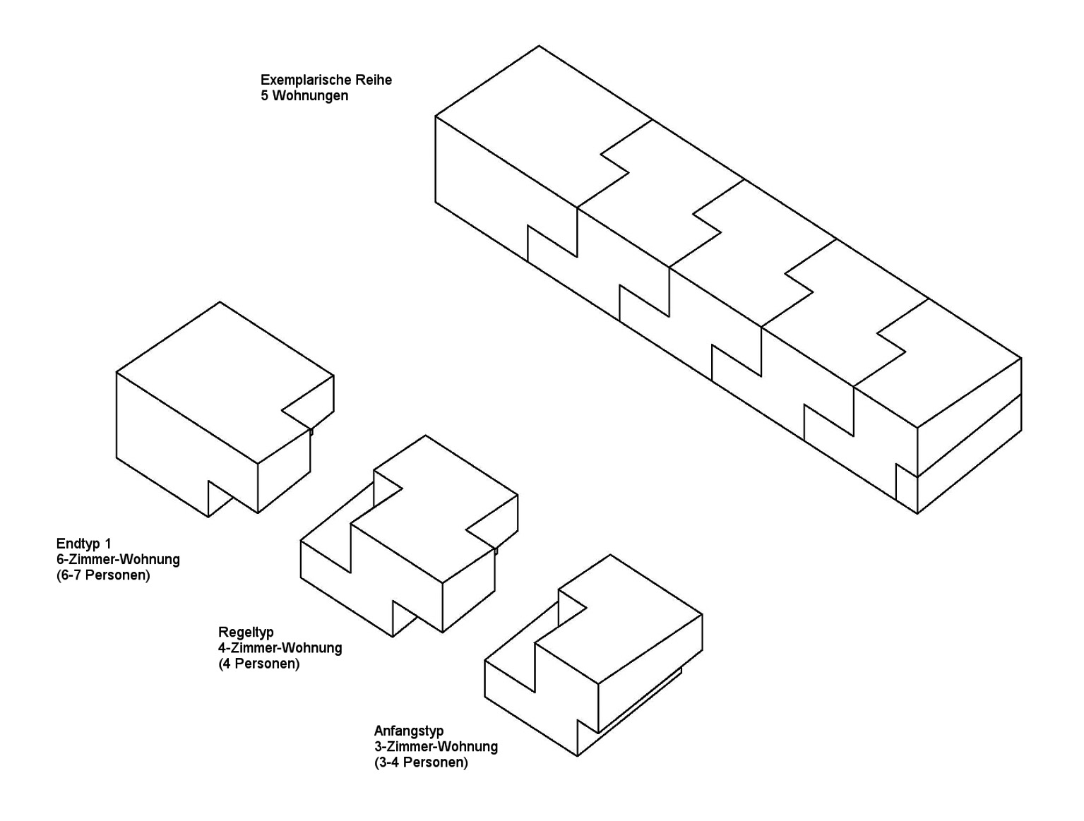 Daher sieht das „BV-Lb-Modell“ nicht-unterkellerte Häuserzeilen vor, die aus einem Anfangstyp (3-Zimmer-Wohnung), beliebig vielen Regeltypen (4-Zimmer-Wohnungen) und einem Endtyp (6-Zimmer-Wohnung) bestehen. Jede Wohnung verfügt über Erdgeschoss und 1. Obergeschoss. Aufgrund der unterschiedlichen Wohnungsgrößen entsteht Wohnraum für Paare, Familien oder WGs. Um dieses Raumangebot noch für Singles zu erweitern und auch Mehrgenerationenwohnen zu ermöglichen, plant das Konzept eine „Reihe B“ ein. In dieser Häuserzeile könnte der sonst sehr geräumige Endtyp in eine 1-Zimmer- und eine 3-Zimmer-Wohnung unterteilt werden. Vorgefertigte Raumzellen, etwa für den Technikraum oder Fertigbäder, sorgen für effektiven Umgang mit der vorhandenen Fläche. Erschließungswege auf der Gartenseite ermöglichen Anlieferungen aller Art und bilden zugleich die Gemeinschaftszone der Siedlung. Die Abgrenzung zum privaten Garten wird über einen Höhenunterschied von 50 Zentimetern gewährleistet. Ein überdachter Einstellplatz für Fahrräder und ausreichend Parkplätze sind ebenfalls Teil des Bebauungsplanes. Pro Häuserzeile existiert eine gemeinsame Technikzentrale für die erforderliche Haustechnik.