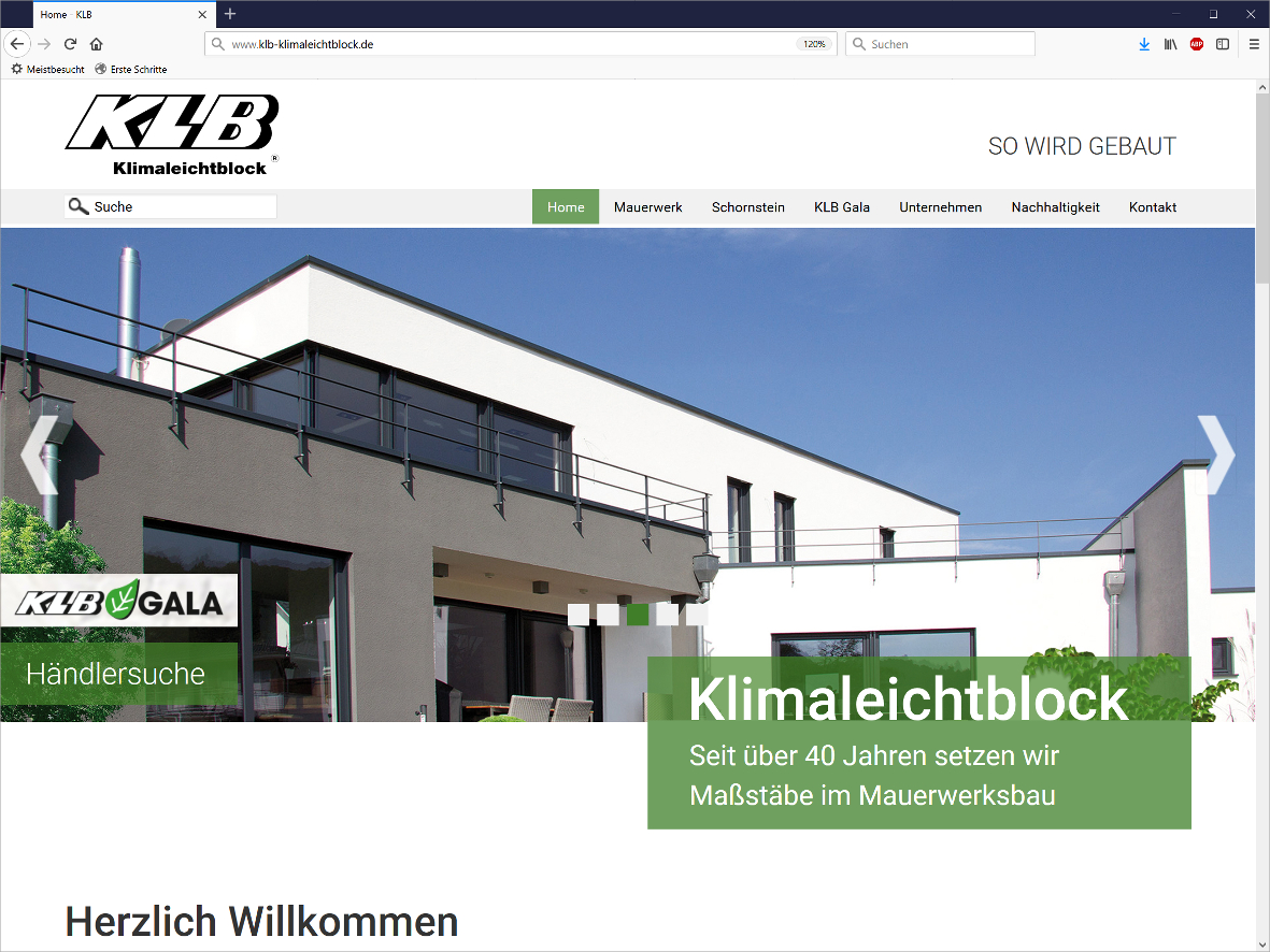 Frisches Design zum Frühlingsanfang: Die KLB Klimaleichtblock GmbH verfügt seit Ende April über eine erneuerte Website (www.klb-klimaleichtblock.de). Bei der Überarbeitung standen vor allem Gestaltung und Nutzerfreundlichkeit im Fokus. Die digitale Heimat des Leichtbeton-Herstellers aus Andernach erhielt im Zuge des Relaunches eine moderne Optik mit intuitiver Menü-Führung. Den Nutzern wird nun der Zugriff auf besonders interessante Themenfelder erleichtert: So führt beispielsweise der integrierte GALA-Button direkt zur betreffenden Unterseite. „Dies erschien uns sinnvoll, da seit Einführung der KLB-GALA-Linie ein immer größer werdender Anteil der Nutzer den direkten Zugriff auf diese Produkte sucht“, erläutert KLB-Geschäftsführer Andreas Krechting. Die Website fügt sich in das rundum erneuerte Corporate Design des Unternehmens ein.