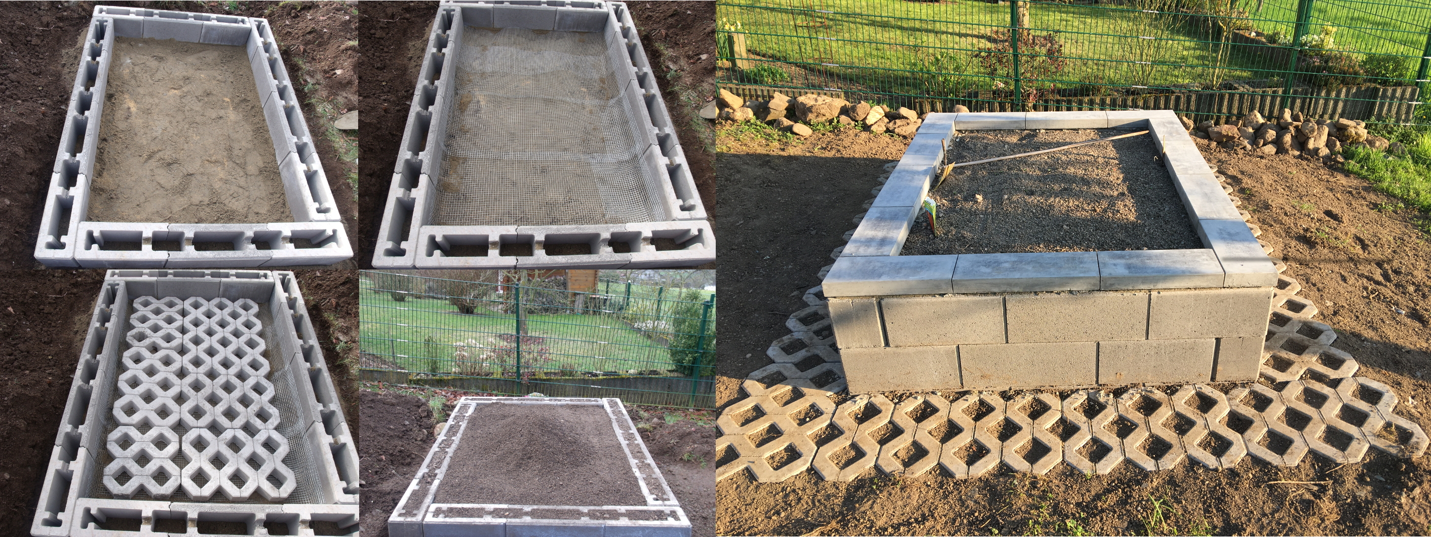 Das Praktische an der Konstruktion von KLB: Die verwendeten Schalungssteine aus Leichtbeton werden in mehreren Reihen übereinander aufgebaut. So kann die Höhe des Hochbeetes problemlos auf die Größe der jeweiligen Nutzer abgestimmt werden. In Melsbach beispielsweise wurde das Beet in einer Höhe von 60 Zentimetern errichtet, damit alle Grundschüler ohne Mühe daran arbeiten können. Wichtig ist beim Aufbau zunächst eine ebene Fläche aus Lava oder Splitt anzulegen, damit die Außenwände auf einem stabilen Untergrund in Waage stehen. Für ein Hochbeet mit den Maßen 1 mal 1,50 Meter – wie im Melsbacher Schulgarten – werden je Lage 14 KLB-Schalungssteine benötigt: je 8 End- und 6 Normalsteine. Beim Aufbau ist vor allem auf rechtwinklig ausgebildete Ecken zu achten. Die weiteren Lagen bis zur gewünschten Höhe werden dann im Versatz aufgebracht. „Zur Verbesserung der Stabilität haben wir die drei Steinlagen in Melsbach komplett mit Lava-Granulat befüllt“, erläutert Krechting. Schutz vor unerwünschten Nagern bietet schließlich ein Drahtgitter am Boden des Beetes, welches zusätzlich mit durchlässigen Rasengittersteinen ausgelegt wurde. Zur Isolierung dient eine Noppenfolie, die auf der Innenwand des Beetes angebracht ist.