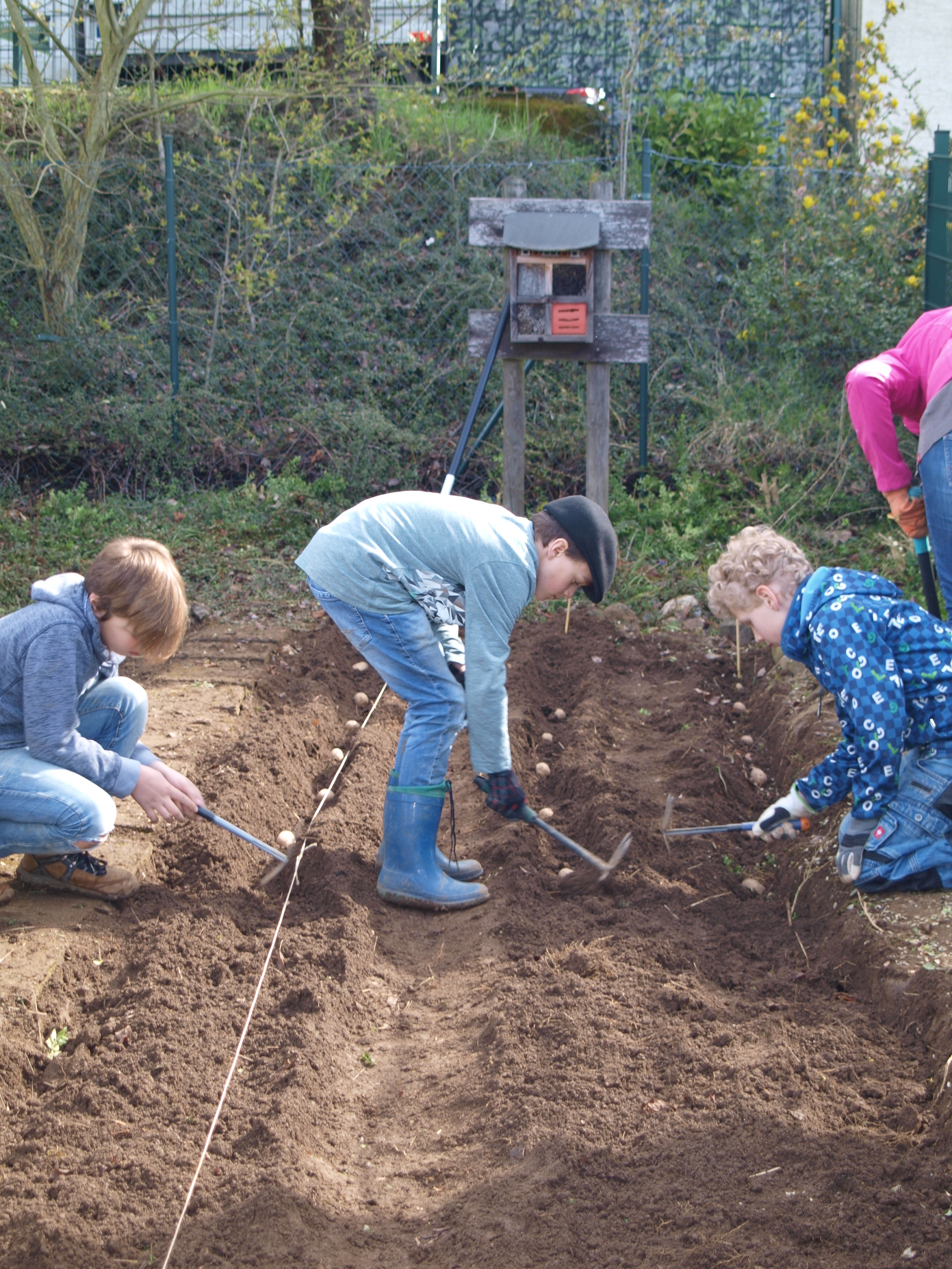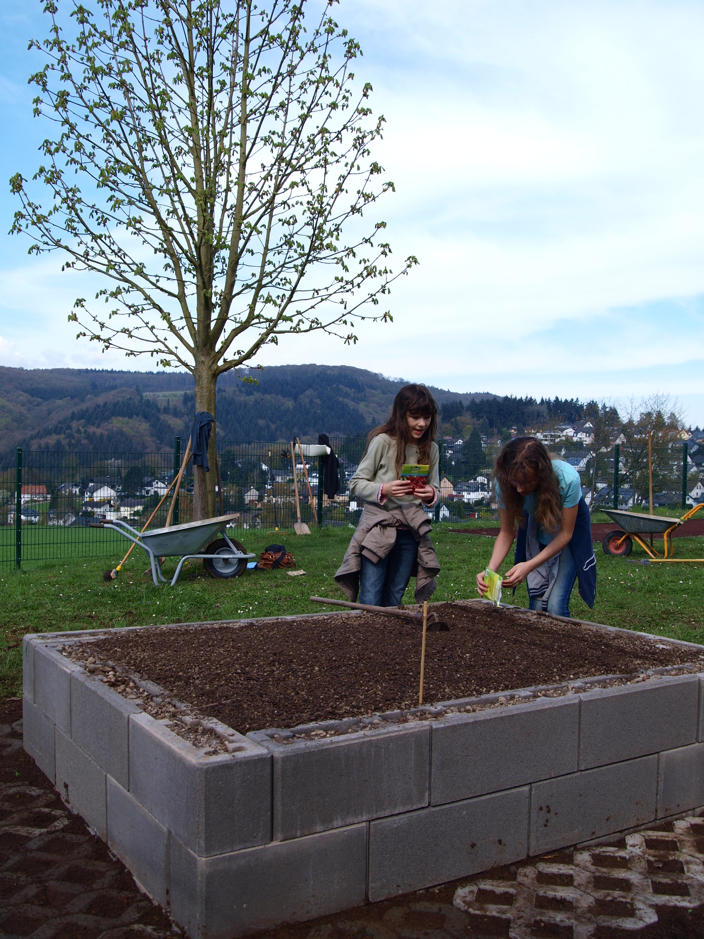 Pünktlich zum Durchbruch der ersten Sonnenstrahlen in diesem Jahr konnte das Hochbeet der Grundschule in Melsbach bepflanzt werden. In einer großen Wochenendaktion weihten Eltern und Schüler aber nicht nur das neue Beet ein, sondern brachten den gesamten Schulgarten „auf Vordermann“ – alte Buchsbüsche wurden entfernt und stattdessen die Erde umgegraben, um Platz für Nutzpflanzen zu schaffen. „Auf unseren zwei kleinen Äckern bauen wir in diesem Jahr Kartoffeln und Getreide an“, erläutert Rektor Barde. „Aus dem Getreide wollen wir schließlich selbst Brot backen – so lernt jeder den Weg von der Ähre zum Butterbrot kennen.“ Im Hochbeet dagegen pflanzten die Grundschüler Radieschen und Möhren an – natürlich auch für den Gebrauch in der Schulküche. Bei einer zweiten Gartenaktion folgen noch Bohnen. Außerdem soll das Hochbeet dann auch gestaltet werden. Die Schüler dürfen sich hier kreativ austoben und die grauen Leichtbeton-Steine in ein buntes Kunstwerk verwandeln. So kann sich Jeder genau da einbringen, wo seine Stärken liegen: als Gärtner, Koch oder Künstler.