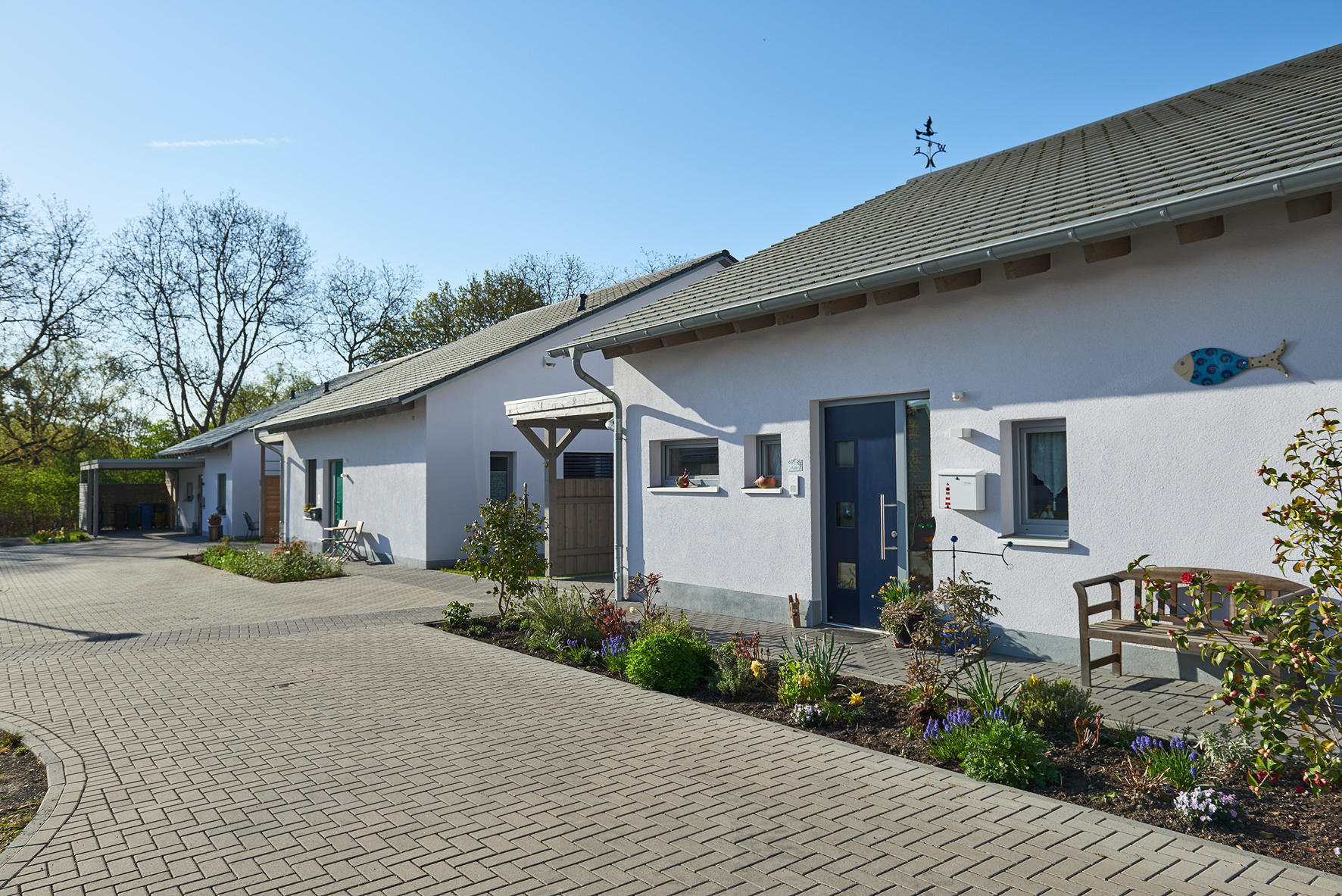Doch nicht nur bei den Wandbaustoffen wurde auf Nachhaltigkeit und Energieeffizienz geachtet: So werden sämtliche Gebäude auf dem Gelände mittels einer Holzpelletheizung in Kombination mit einer Solarthermieanlage beheizt. Bei ausreichend Sonnenschein wird die benötigte Heizenergie komplett über die Solaranlage auf den Gebäudedächern generiert. Ist diese Energiequelle nicht ausreichend, wird automatisch die Pelletanlage zugeschaltet. Hierfür sind zwei Heizkessel im Keller des Gemeinschaftsgebäudes untergebracht. Diese werden alternierend betrieben. Die Befüllung erfolgt dabei automatisch über eine Förderschnecke, welche die Holzpellets direkt aus dem angrenzenden 30 Kubikmeter großen Pelletlager zuführt. Mit einem Jahresheizwärmebedarf der Wohnhäuser von je 38,42 kWh/m²a gehen hier die durchdachte Gebäudehülle und das fortschrittliche Heizkonzept – und damit Planung- und Nutzungsphase – nahtlos ineinander über.