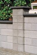 Quadratische Pfeiler von 35 x 35 cm können aus 4 Stück 17,5er Endsteinen erstellt werden. Die Bewehrungsführung von der Mauer zum Pfeiler ist durch Einschneiden von Schlitzen in den Endstein möglich. Der Anschluss der Mauer an einen Pfeiler erfolgt mit Eck- und Endsteinen im Wechsel je Lage. Zur Abdeckung des Pfeilers sind Spitzdach-Pfeilerabdeckungen im Format 45 x 45 cm erhältlich.