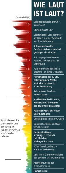 Eine deutlich wahrnehmbare Verbesserung des Schallschutzes tritt bei leisen Geräuschen ab etwa 3 dB, bei sehr lauten Geräuschen bei etwa 10 dB höherer Schalldämmung ein. Aus diesem Grund ist die Festlegung der Schallschutzqualitäten der Bauteile vor allem im Mehrfamilien-Wohnungsbau im Idealfall mit dem Nutzer vorab zu klären. Dabei muss beachtet werden, dass eine absolute Ruhe innerhalb einer Wohnung nicht erreicht werden kann, da die Geräuschentwicklung der verschiedenen Schallquellen nicht immer beinflussbar ist. Die Skala auf Seite 3 zeigt den alltäglichen Lärmpegel verschiedener Verursacher und erlaubt somit eine vergleichende Abschätzung der Störwirkung und des gewünschten Schutzziels.