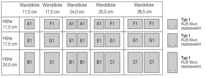 KLB-Stürze, tragend stabbewehrt sind allgemein bauaufsichtlich zugelassen, Zulassung Z-15.4-283. Die Werte für zentrische oder exzentrische Belastung als Gleichstreckenlast oder Dreieckslast sind in Tabellen der Zulassung enthalten.
