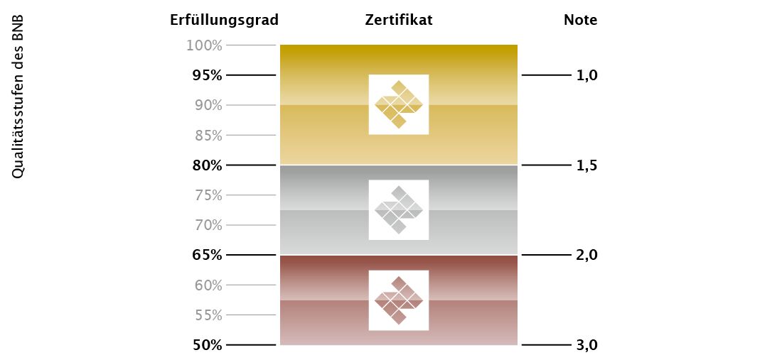 Eine Zertifikatvergabe nach BNB erfolgt anhand der Bewertung von knapp 50 Kriterien, die in denselben zuvor erläuterten sechs DGNB-Hauptkriteriengruppen zusammengefasst werden. Die Gewichtung dieser Kriteriengruppen für die Endnote entspricht ebenfalls der Zertifizierung nach DGNB. Einzig die ausgewiesenen Qualitätsstufen unterscheiden sich: Dem Gesamterfüllungsgrad nach BNB wird eine Note zugeordnet, die einer der drei Qualitätsstufen „Bronze“, „Silber“ oder „Gold“ gleichkommt.