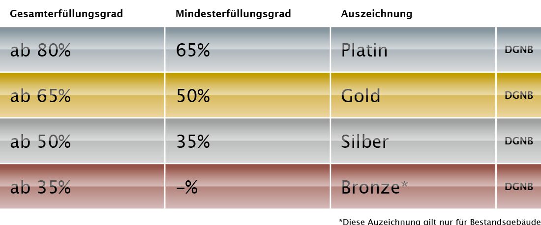 Der Gesamterfüllungsgrad ist dabei nicht allein entscheidend für die Zertifikatsvergabe. Um ein Zertifikat zu erhalten, muss in jedem der fünf bewertungsrelevanten Themengebiete ein Mindesterfüllungsgrad erreicht werden, welcher 15 Prozentpunkte unter dem nötigen Gesamterfüllungsgrad liegt (ausgenommen die Zertifizierung in Bronze). So kann also ein Gebäude beispielsweise nur dann ein Zertifikat in Platin erhalten, wenn der Gesamterfüllungsgrad bei mindestens 80 % liegt und der Erfüllungsgrad der einzelnen Themengebiete bei jeweils mindestens 65 %.