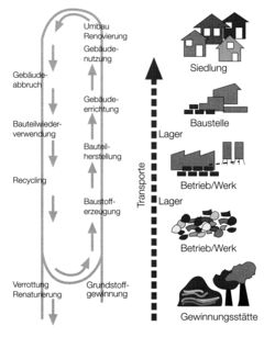 Das folgende Schema zeigt den gesamten „Lebenszyklus“ eines Produktes von der Rohstoffgewinnung über die Nutzung bis zum Abbruch und dem damit verbundenen Recycling. In allen Bauphasen sind die möglichen Belastungen auf ein Mindestmaß zu senken. So bei der Gewinnung von Grundstoffen für die Bauprodukte, bei ihrer Herstellung und beim Bauvorgang selbst. Später dann beim fertigen Gebäude in allen Nutzungsphasen, aber auch im Gefahrfall, z. B. bei einem Brand. Letztendlich beim eventuellen Abbruch und der dann erforderlichen Entsorgung.